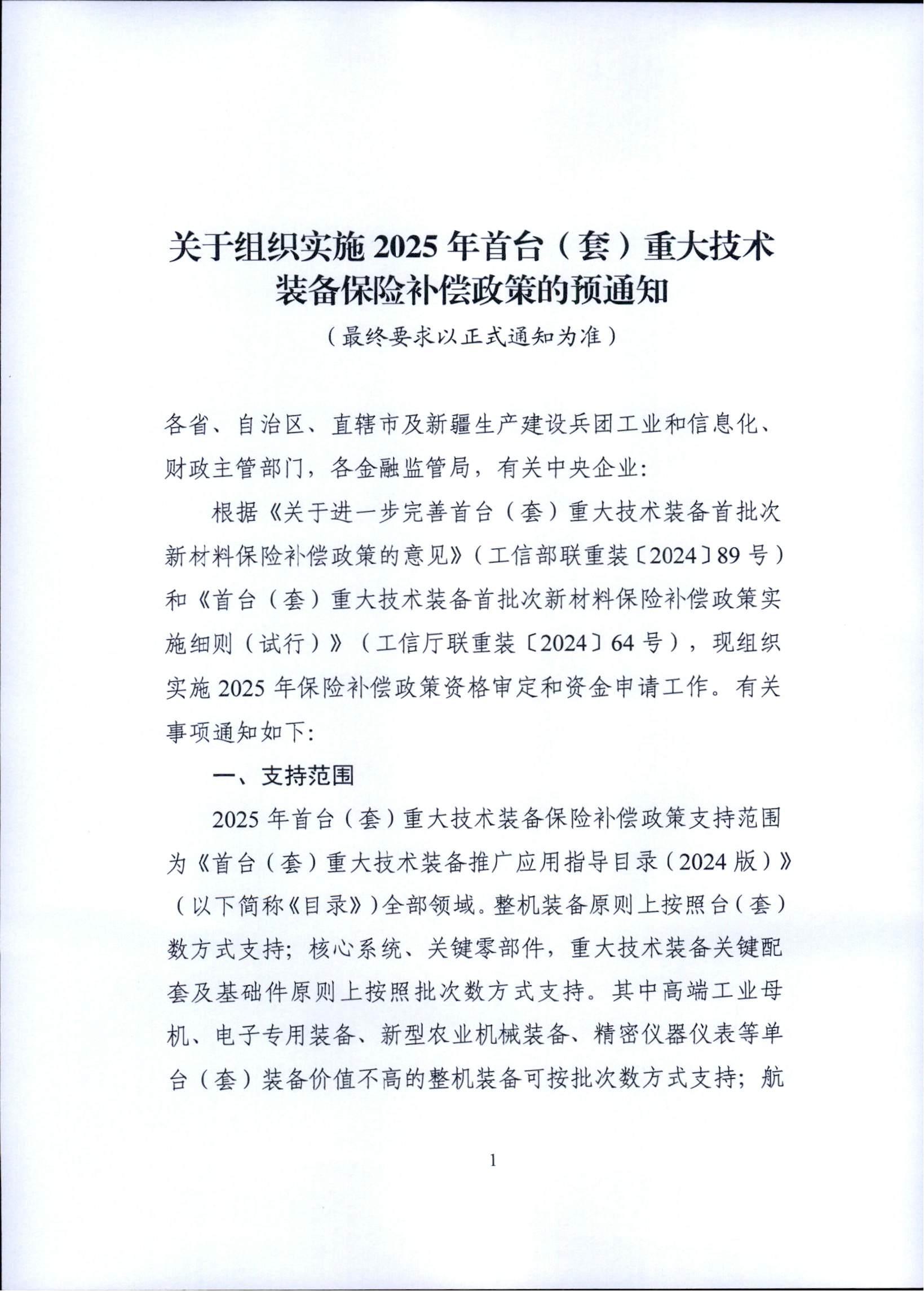 附件:关于组织实施2025首台(套)重大技术装备保险补偿政策的预通知.pdf